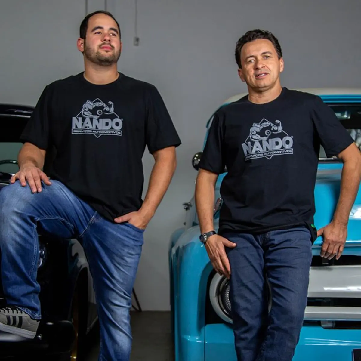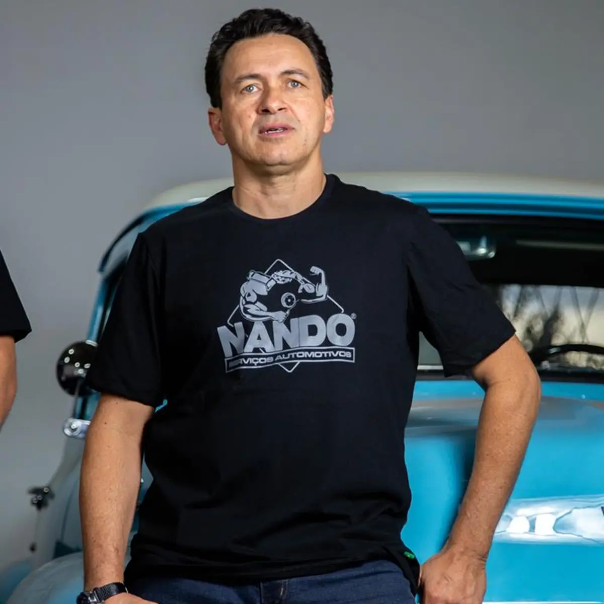 Camiseta preta oficial Nando SA com logo cinza.