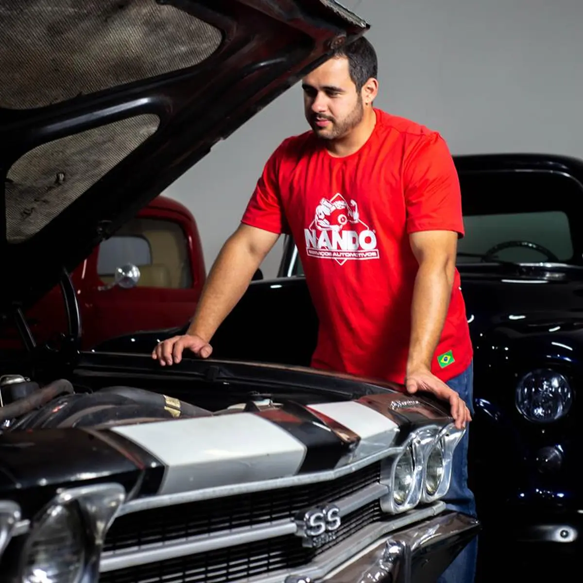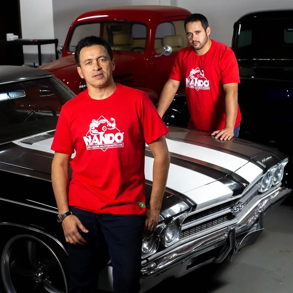 Camiseta vermelha oficial Nando SA com logo branca.